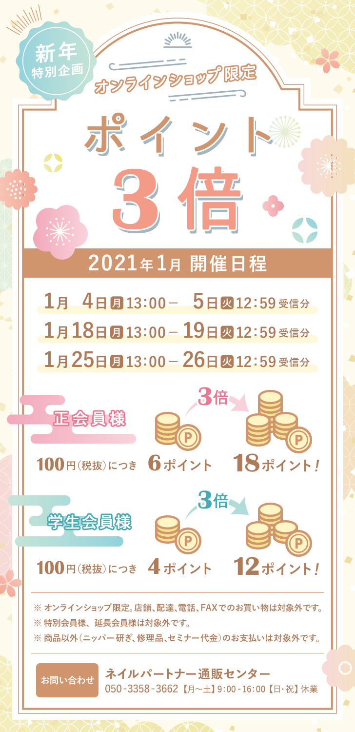 オンラインショップ限定 新年特別企画 ポイント3倍 プロ向けネイル用品卸のネイルパートナー 店舗 通販